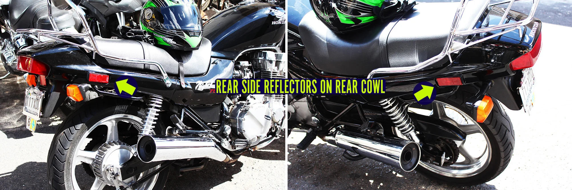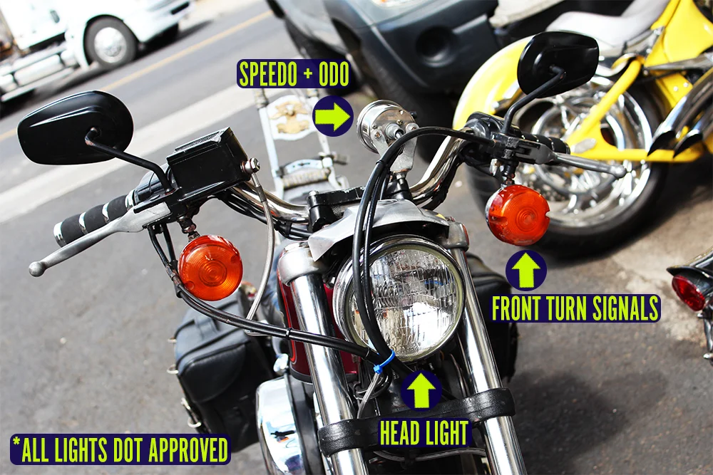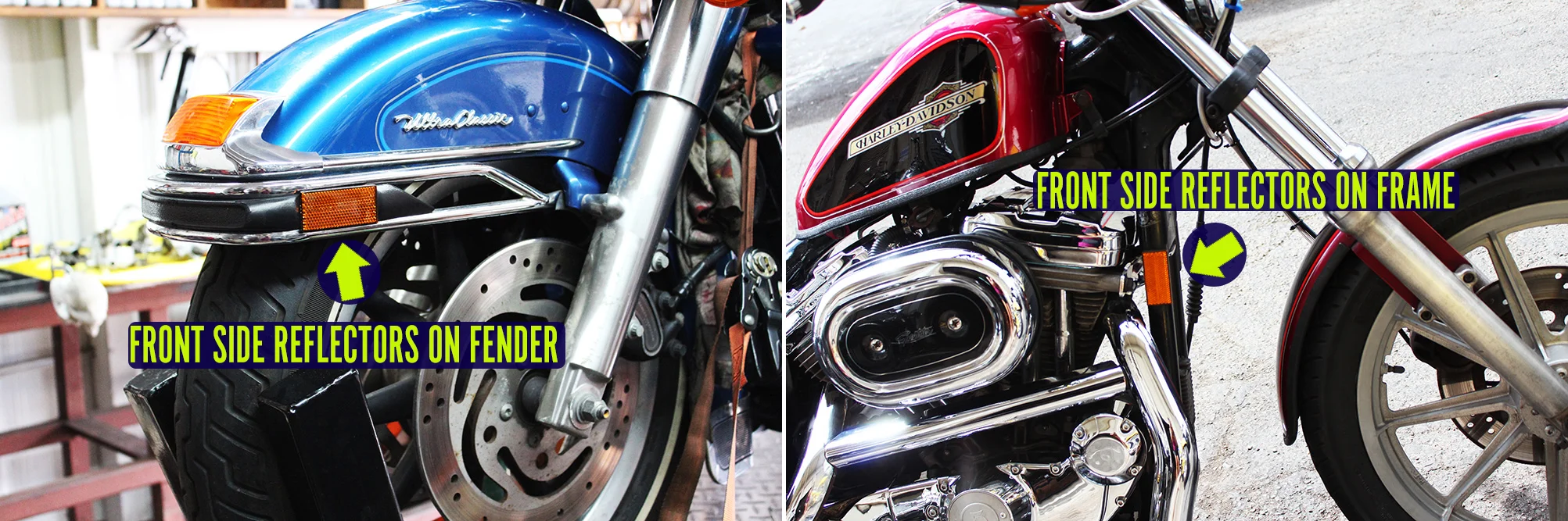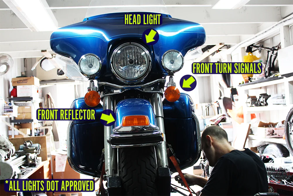 Please read below about the exact state requirements for turn signals, all lights, and reflectors. If your bike does not meet these requirements, your bike won’t pass inspection. Please don’t ask us to let you slide, because we could lose our license if we did that. We don’t make the laws. We provide safety inspections as a service to all our customers.