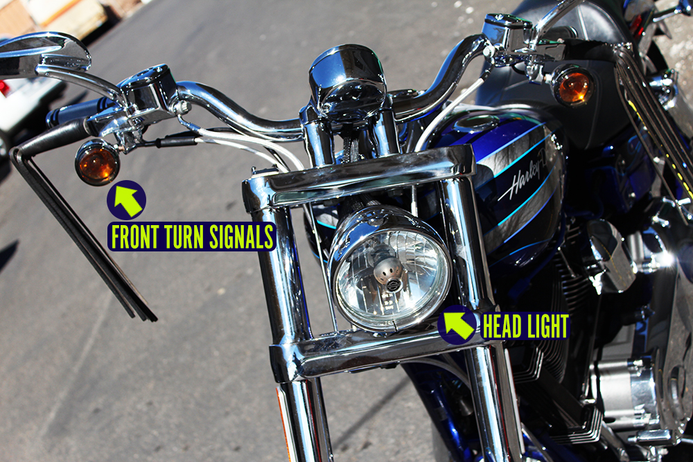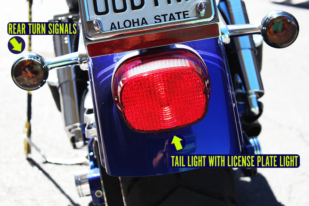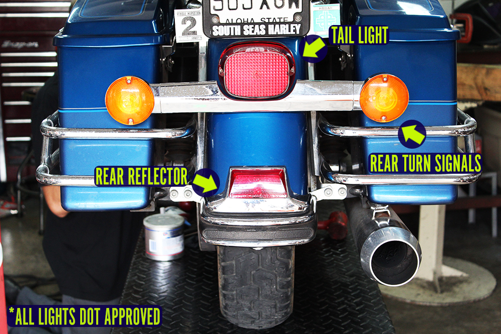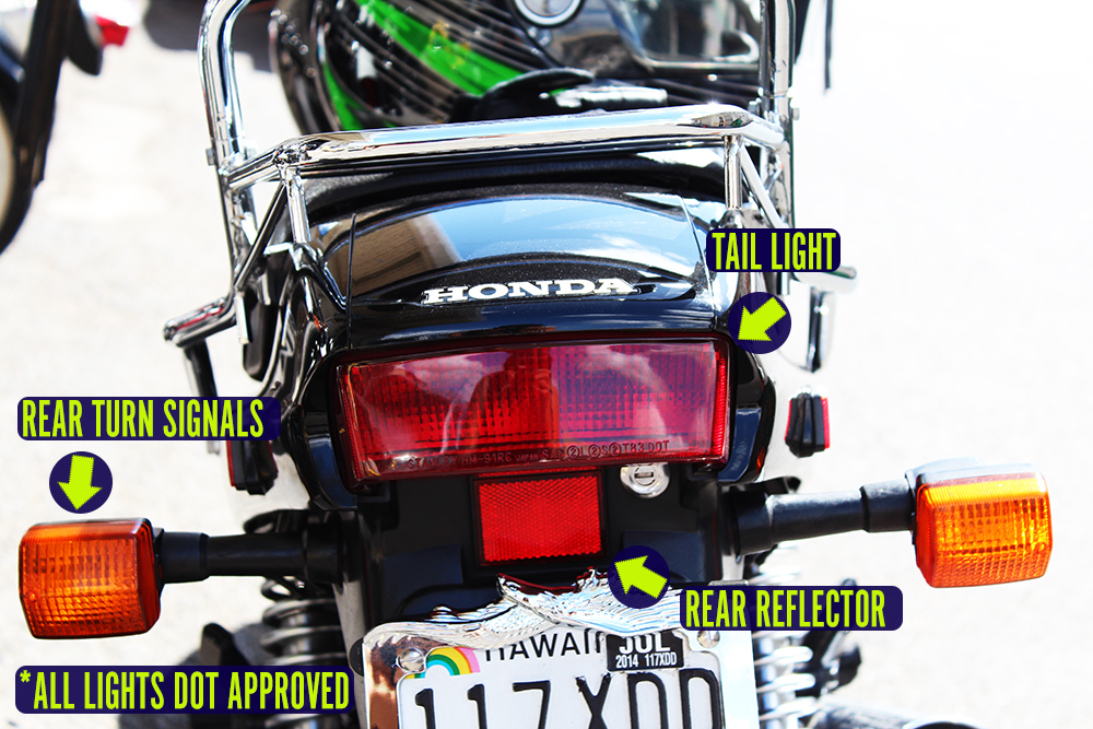 We’ve provided the following photos as examples of what the required safety equipment could look like on your bike. Everyone’s bike is different so we’ve tried to include a few examples in each section. If you have questions, refer back to the list of safety inspection regulations per the City and County of Honolulu above, or email or call us. Remember, the license plate should be at the back of the bike, and all lights and reflectors must be DOT or SAE approved. If you are changing out your stock safety equipment and buying new ones on your own, make sure what you purchase is in alignment with the above regulations. It will save you time and money.