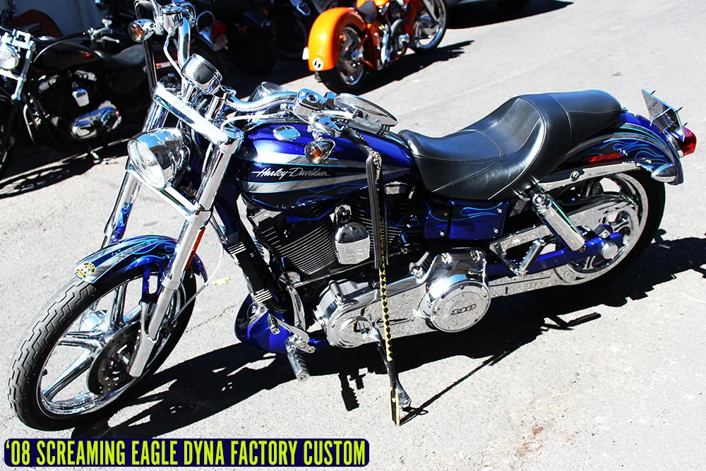 Here are some photos of a factory custom 2008 Harley-Davidson Screaming Eagle Dyna. This is a good example of a bike that has the appropriate safety components that are streamlined with the bike, giving it a custom aesthetic, yet the bike is entirely legal.